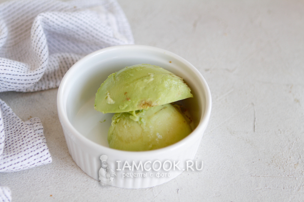 Авокадо разрезать пополам ножом. Удалить косточку и ложкой аккуратно достать мякоть.