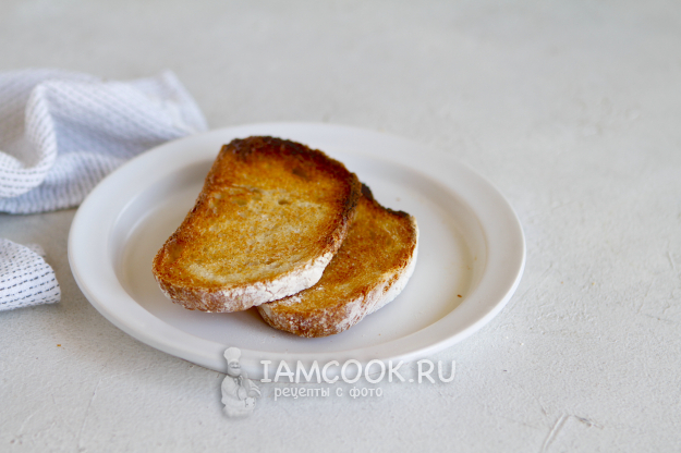 Удобным для вас способом подогрейте хлеб. Меня в этом деле выручает тостер. Кусочки хлеба еще можно прогреть в духовке или на сухой сковороде.