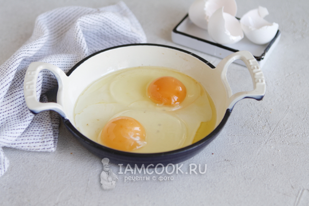 Разбиваем в нее два яйца. Сковороду отправляем на плиту и убавляем огонь до средних границ.