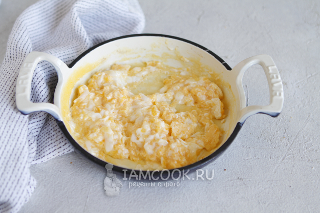 Не трогаем яйца секунд 15. Как только вы увидите, что нижний слой слегка схватился, начинайте перемешивать лопаткой яйца, поднимая их вверх. Масса должна слегка загустеть, появится множество хлопьев. Главное, не передержать яйца на сковороде, чтобы эти хлопья не высохли. Я готовила скрэмбл ровно 2 минуты.