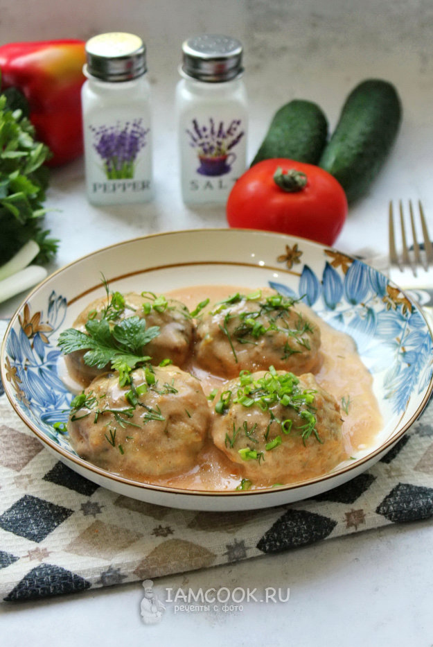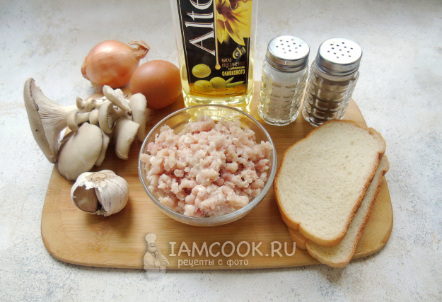 Соберите ингредиенты для приготовления биточков с грибами в духовке. На первом фото всё, что нужно для биточков.