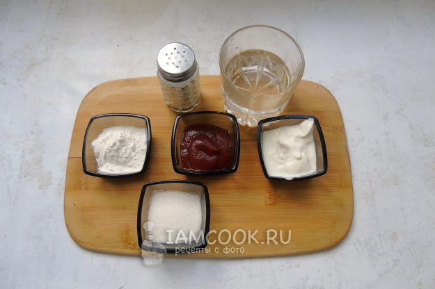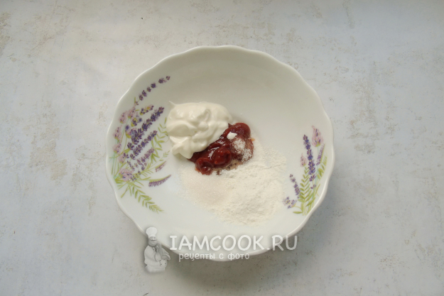 Подготовьте подливу для биточков. В миску выложите томатную пасту, сметану, крахмал, соль и сахар.
