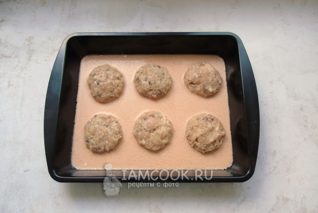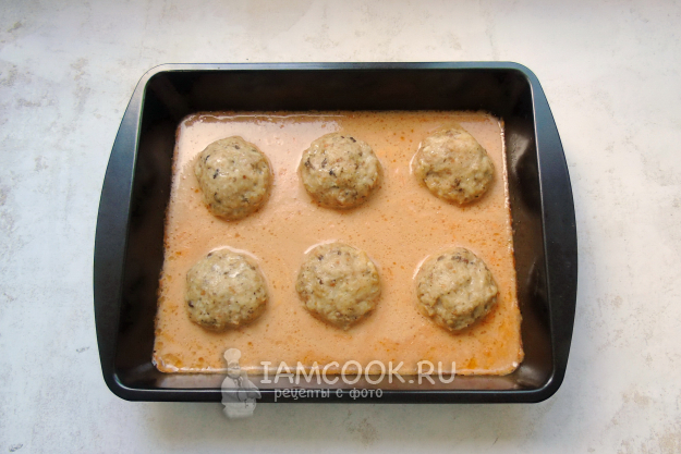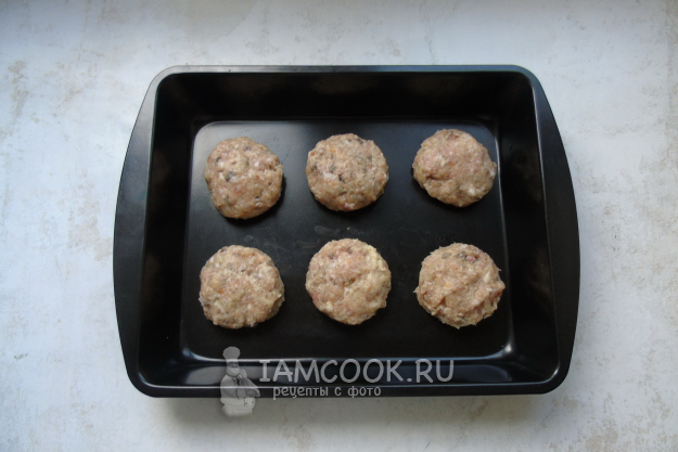 Из приготовленного фарша сформируйте биточки диаметром 5-6 см. Выложите их в форму для запекания.