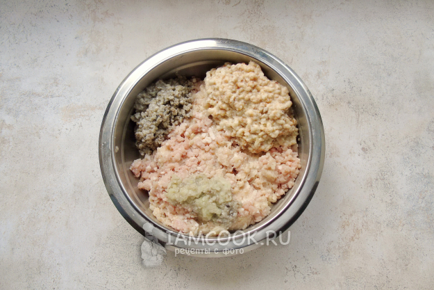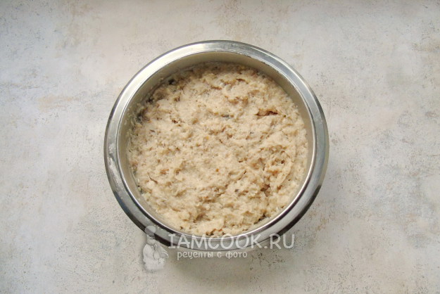 Очень тщательно перемешайте фарш и взбейте погружным блендером для большей однородности. Или отбейте его, беря небольшими порциями.