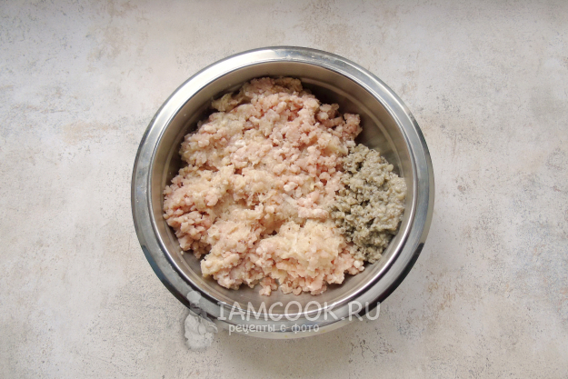 Мясной фарш (у меня свиной) выложите в миску. Пропустите жареные грибы через мясорубку и добавьте к фаршу.