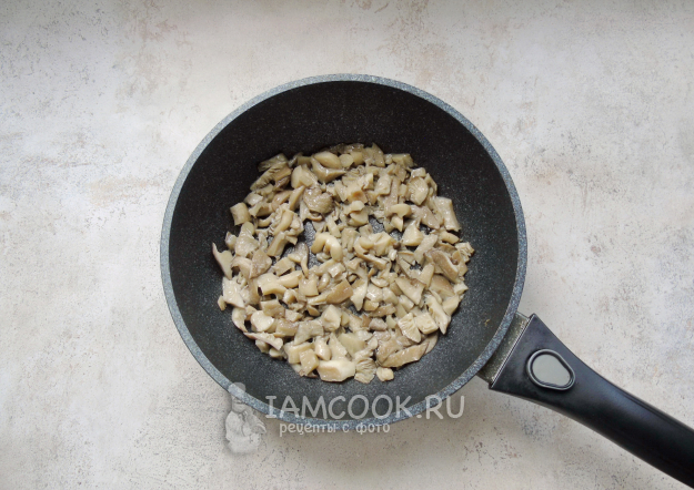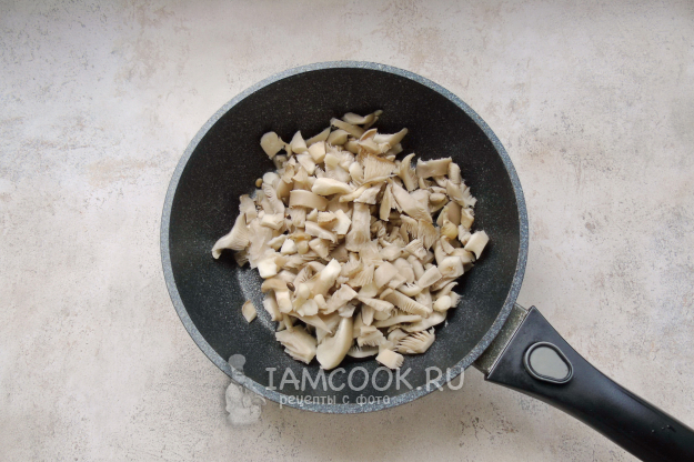 Вешенки помойте, удалите толстые части грибов и после нарежьте. Выложите в сковороду.