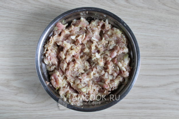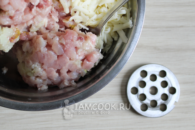 С куриных бедрышек снимите филе. Если не хотите рубить куриное мясо вручную, то прокрутите его в мясорубке, и желательно через насадку с крупными ячейками.