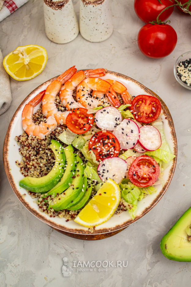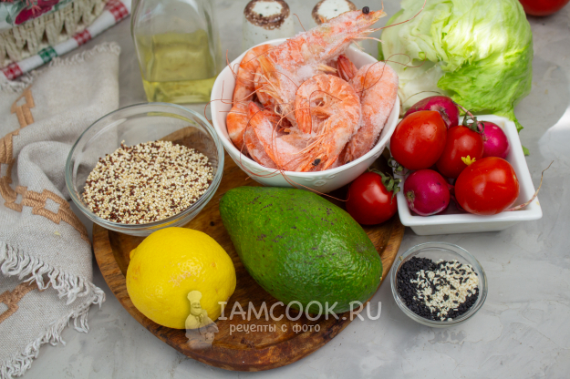 Подготовьте по списку продукты для боула с киноа и креветками. Из данного количества ингредиентов у меня получилось собрать 2 боула. Некоторые овощи или зелень вы можете поменять на ваше усмотрение.