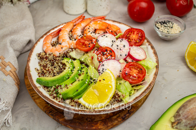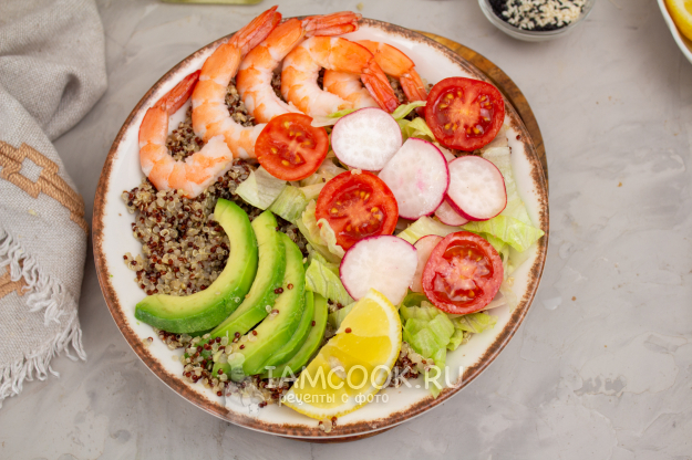 Далее по кругу выложите креветки, слайсы авокадо и микс из салата и овощей.