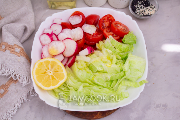 Салат айсберг и овощи помойте, обсушите и нарежьте. Выложите на тарелку, посолите и сбрызните соком лимона.