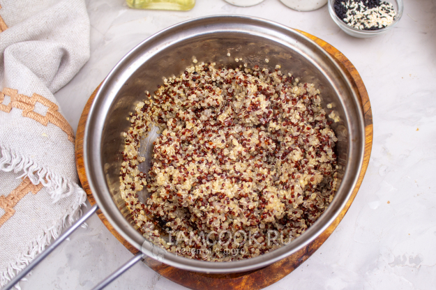 Первым делом отварите киноа согласно инструкции. Я варила 15 минут с момента закипания. Готовое киноа посолите по вкусу и добавьте одну столовую ложку оливкового масла, перемешайте и дайте остыть.