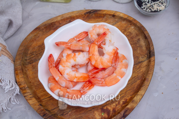 Креветки (у меня варено-мороженые) опустите в кипящую воду на 1 минуту, затем сразу переложите в холодную. Остудите и очистите, удалите панцирь, голову и извлеките кишечник. По желанию креветки можно обжарить с чесноком.