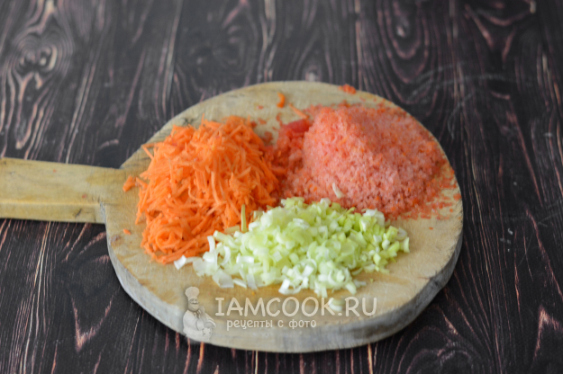 Мелко нарежьте лук-порей, натрите на терке морковь и помидор.