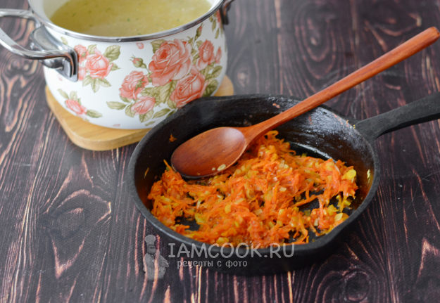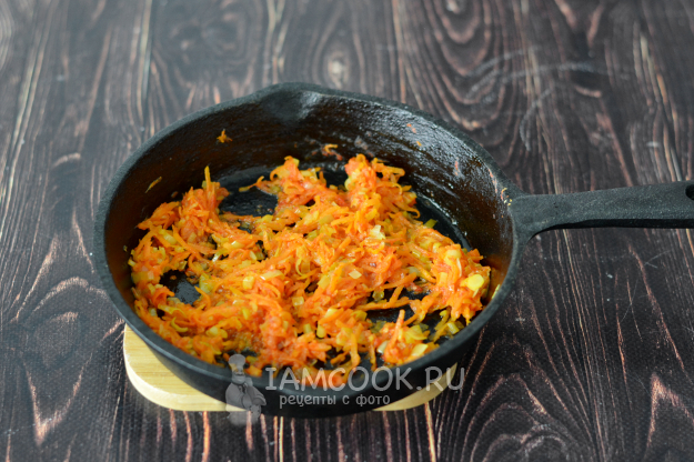 На разогретом масле сначала слегка поджарьте порей с морковью, около 5-7 минут. Затем добавьте натертый помидор и обжарьте всё вместе еще 2-3 минуты.