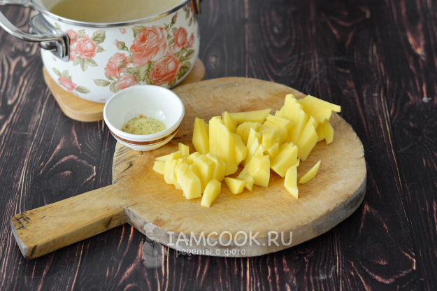 Вскипятите в кастрюле воду, в кипящую воду положите нарезанный брусочками картофель, соль и овощную приправу.