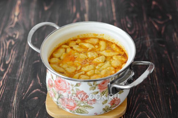 И следом за заправкой начните опускать в кипящий суп клецки.