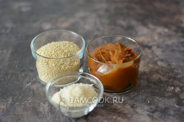 Соберите все необходимые ингредиенты для приготовления конфет из вареной сгущенки с кунжутом и кокосовой стружкой.