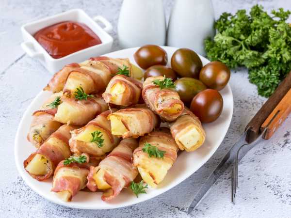 Горячую картошку, фаршированную беконом, сразу подавайте к столу. Это вкусно, сытно и очень ароматно!