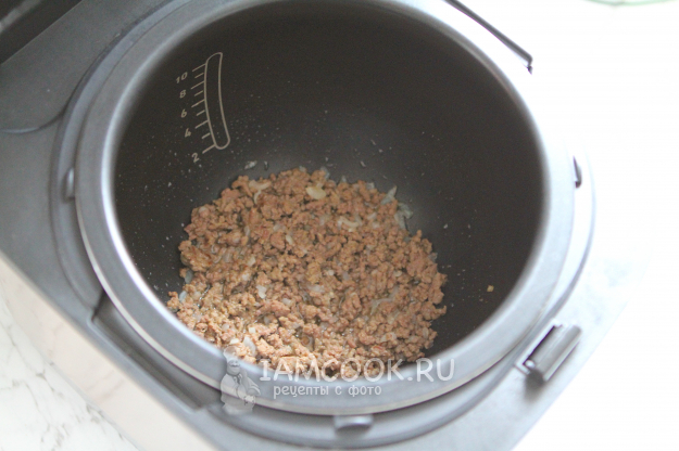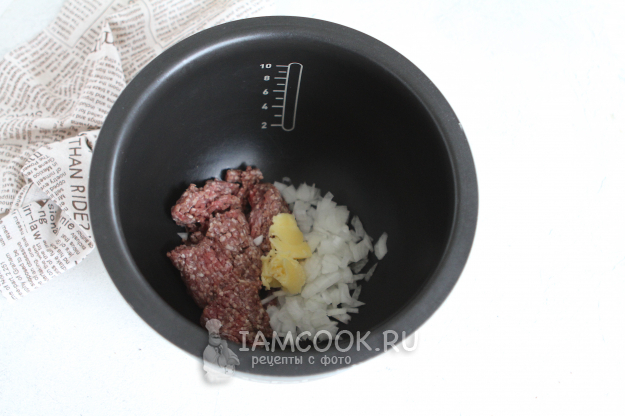 В чашу мультиварки отправляем фарш, лук и масло. Масло можно использовать любое. Я готовила на топленом масле.