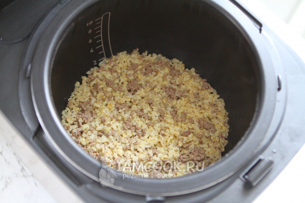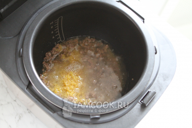 Выставляем режим "Тушение" - "Мясо", время - 40 минут. Можно, конечно, обжарить фарш, но мне нравится мясо, приготовленное именно на режиме "Тушение". Фарш получается нежнее. Когда будет готов фарш, добавляем соль и любимые специи по вкусу. Вкус булгура с фаршем можно разнообразить за счет сушеных трав и различных пряностей.