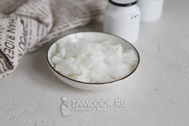 Одну небольшую головку репчатого лука почистить и нарезать небольшими квадратиками.