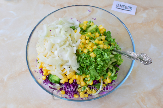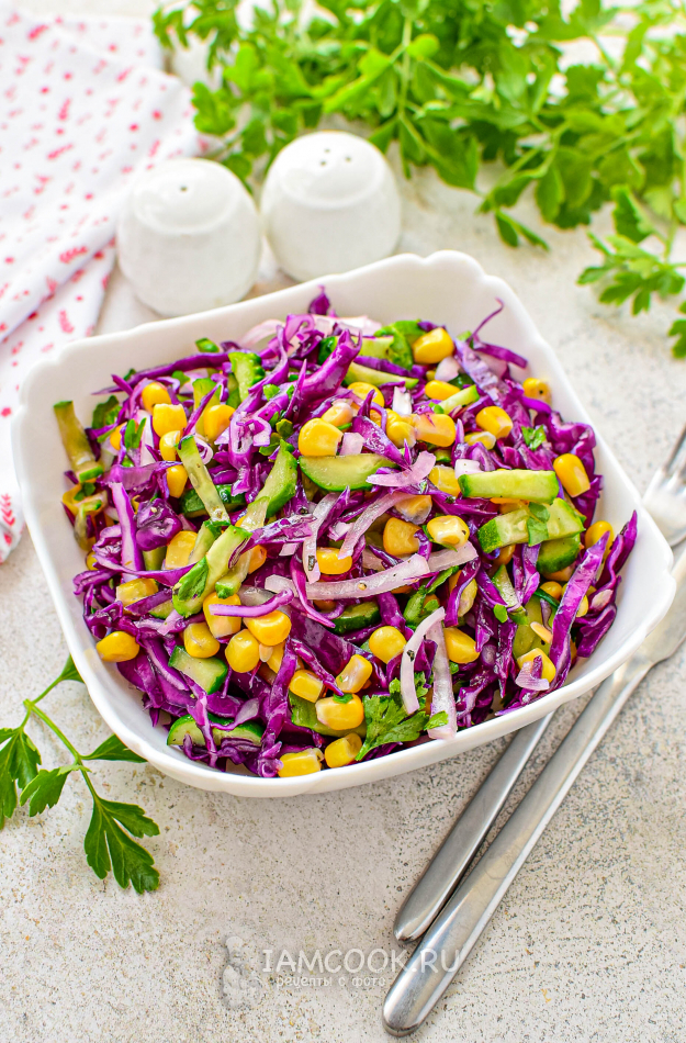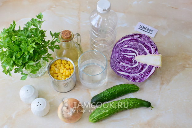 Для приготовления салата из красной капусты с кукурузой и огурцом соберите необходимые ингредиенты по списку. Пропорции можно немного поменять на свой вкус.