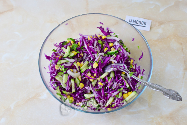 Заправьте салат растительным маслом. По вкусу добавьте соль и молотый перец. Всё перемешайте. Готовый салат из красной капусты с кукурузой и огурцом выложите в подходящий салатник и подавайте к столу.