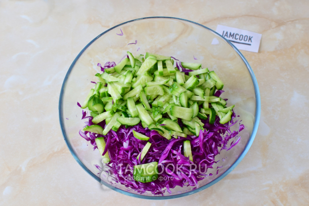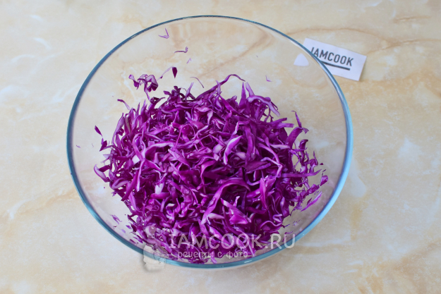 Капусту тонко нашинкуйте, немного помните руками и выложите в салатник.
