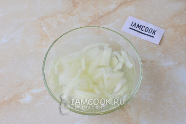 Лук очистите, ополосните в холодной воде и нарежьте полукольцами (или чуть мельче). Выложите лук в небольшую миску. Добавьте уксус и воду. Оставьте постоять минут на 10-15, за это время лук промаринуется. Затем слейте с него жидкость и промойте холодной водой.