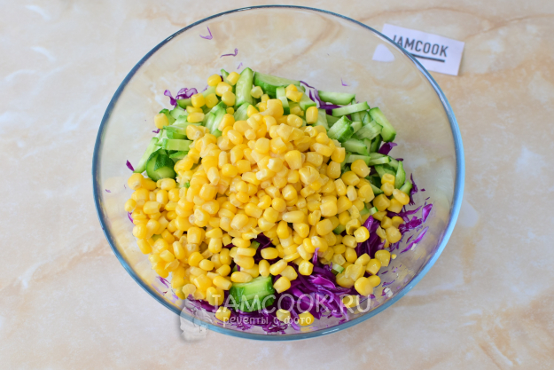 С консервированной кукурузы слейте жидкость и выложите зерна в салат.