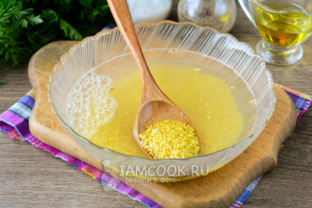 Пшенную кашу тщательно промойте несколько раз, затем всю жидкость слейте.