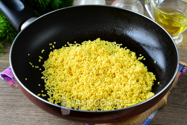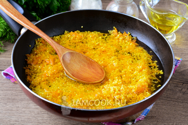 Разогрейте сковороду с растительным маслом, всыпьте туда промытое пшено. Обжаривайте крупу 3-4 минуты, до появления приятного аромата. Помешивайте.