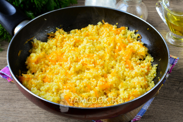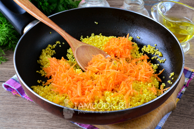 К обжаренной каше всыпьте морковь и жарьте все вместе еще пару минут. Морковь придаст крупе дополнительный нежный вкус.