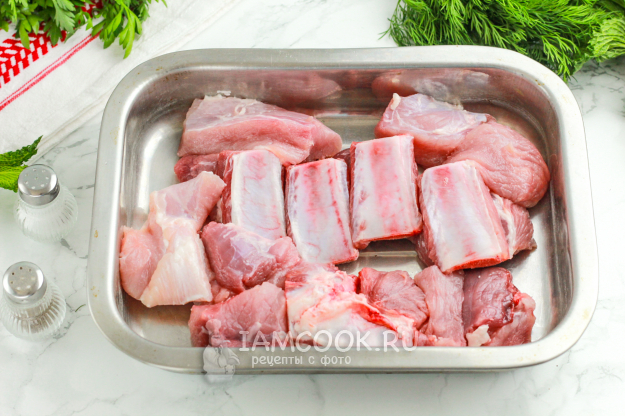 Мясо промойте в воде и обсушите бумажными салфетками. Срежьте жилы и пленки, разрежьте на части, чтобы в каждом кусочке мяса была косточка. По желанию можно и не нарезать, а запечь целым куском. Тогда время запекания чуть увеличится.