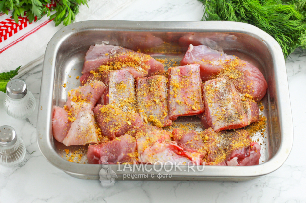 Я предлагаю добавить обычную мясную приправу, но и ее можно заменить любыми специями и пряностями по вашему желанию. Чеснок и лук не добавляйте - при долгом запекании они не передадут свои вкусы и ароматы.