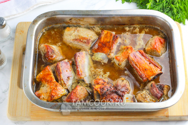 После чего отправьте форму со свиными ребрышками в пиве в духовку на средний уровень примерно на 50-60 минут. Время от времени переворачивайте кусочки мяса и поливайте их пивом для равномерного запекания.