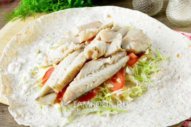 Добавьте кусочки филе обжаренной рыбы. Добавьте по вкусу любую зелень. Сверните лаваш рулетом и обжарьте на сухой сковороде до хрустящей корочки.