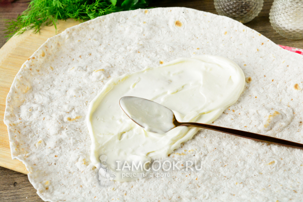 Тонкий лаваш смажьте майонезным соусом с чесноком.