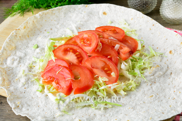 Выложите сверху все овощи - капусту с луком и помидоры.