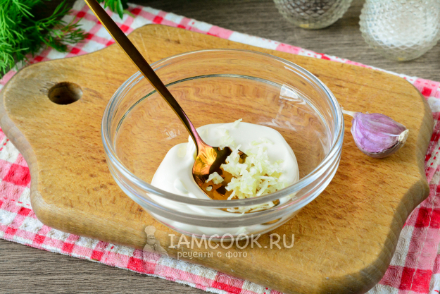 Майонез смешайте с измельченным чесноком - такой соус прекрасно дополнит и овощи, и рыбу.