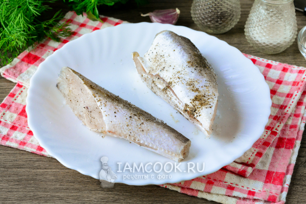 Размороженную рыбу почистите при необходимости, удалите все внутренности, срежьте плавники. Для рецепта я взяла хека. Рыбу посолите и поперчите по вкусу, нарежьте крупными кусками.