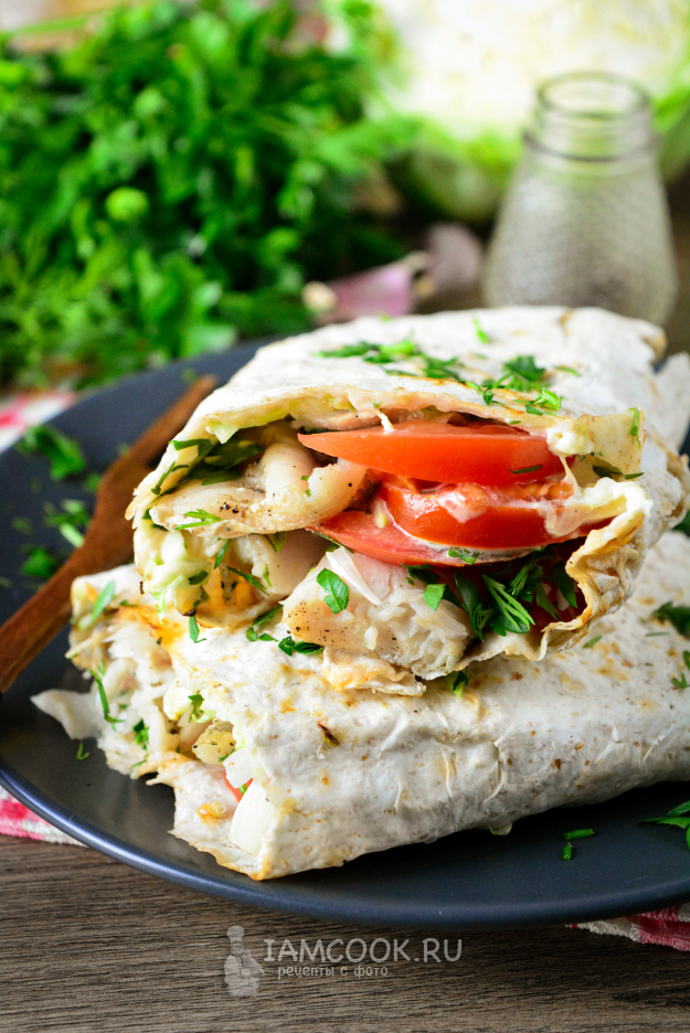 Готовую шаурму с рыбой подавайте к столу. Закуска получается сочной, вкусной и ароматной. Приятного вам аппетита!