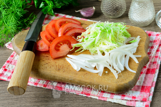 Подготовьте все овощи: нарежьте помидоры, измельчите капусту и репчатый лук. Капуста может быть любая, но в сезон белокочанная молодая капуста подходит просто идеально - она нежная, хрустящая и сочная.