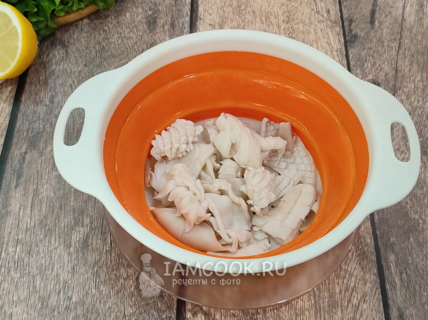 Опускаем кальмаров в кипящую подсоленную воду, варим около минуты. Готово!👌