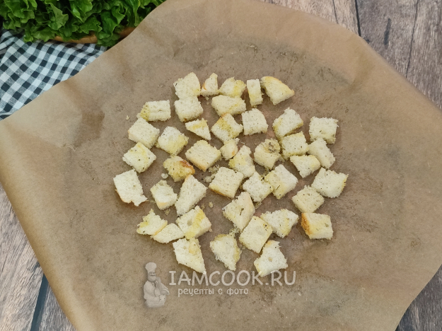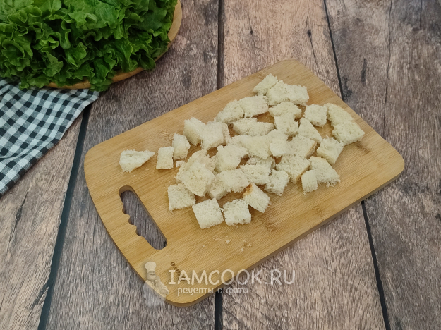 Начнем с сухариков. С ломтиков батона/багета по желанию срежьте корочку. Нарежьте кубиками, не слишком мелкими.