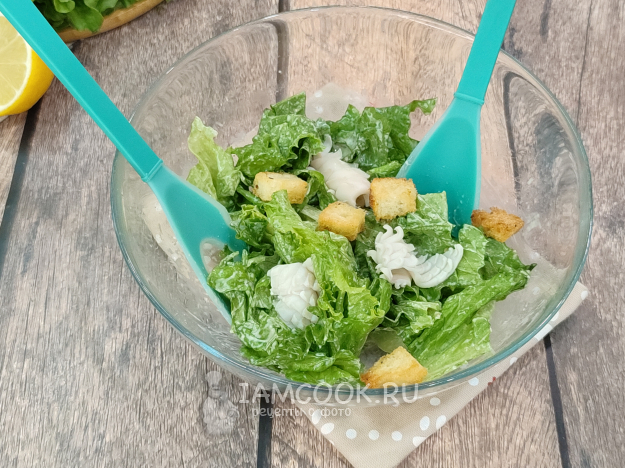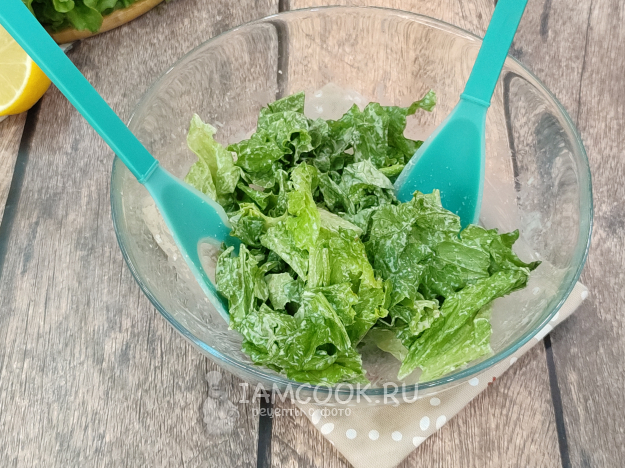 Подготовить гренки и соус (основной ингредиент) для этого салата можно заранее (вечером гости - утром подготовка), но собирать салат нужно непосредственно перед подачей. Вымытые и обсушенные листья салата нарвите в глубокую миску. Добавьте пару ложек соуса - салат не должен утонуть в заправке, лучше добавлять соус постепенно)).