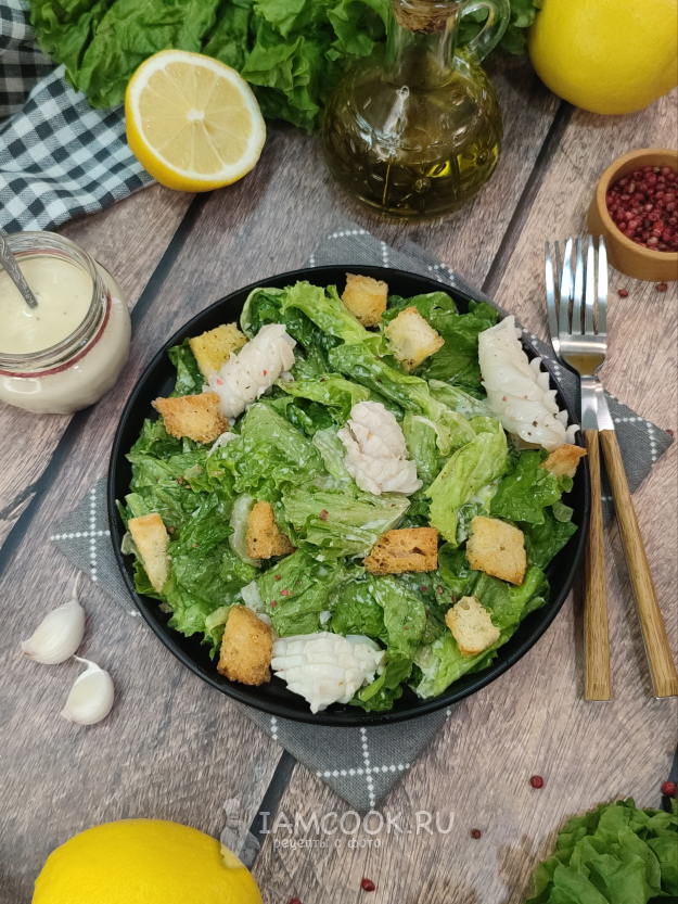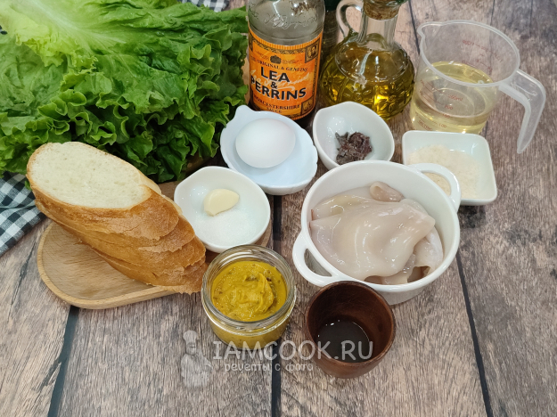 Подготовьте необходимые ингредиенты для салата "Цезарь" с кальмарами. Вообще, в классической версии использовался салат Романо (Ромейн), но, поверьте, не менее вкусно получается и с другими листовыми салатами, главное, чтобы они были свежими и хрустящими. Масло для соуса беру подсолнечное рафинированное, с оливковым нерафинированным соус приобретает горчинку, которую в моей семье не любят.