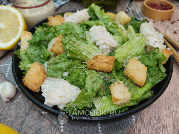 В миску добавляем кальмаров и треть сухариков. Аккуратно перемешиваем.