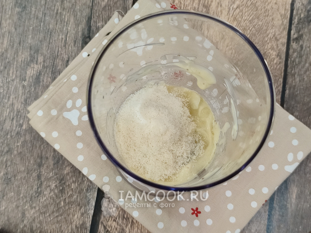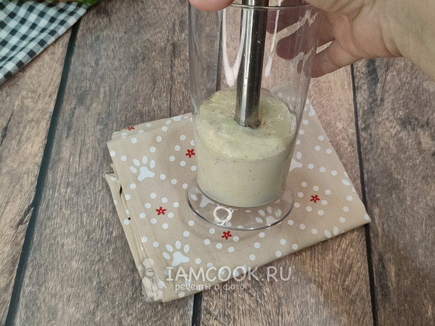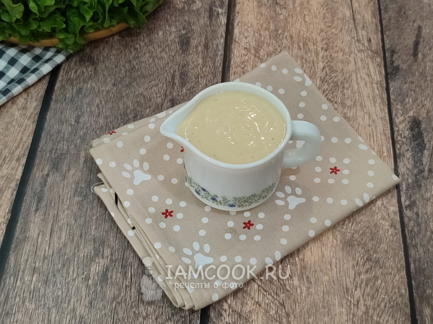 Приготовим главное - заправку! В стакан блендера вливаем масло, вбиваем аккуратно яйцо, желток должен остаться целым. Яйцо предварительно нужно тщательно помыть и опустить в кипяток на минуту, чтобы удалить бактерии. Сразу же добавляем горчицу. Опускаем блендер, накрывая желток, включаем, начинаем взбивать массу, блендер при этом не поднимаем. Когда большая часть массы побелеет, начинаем понемногу приподнимать блендер, продолжая взбивание, чтобы вся масса стала однородной.