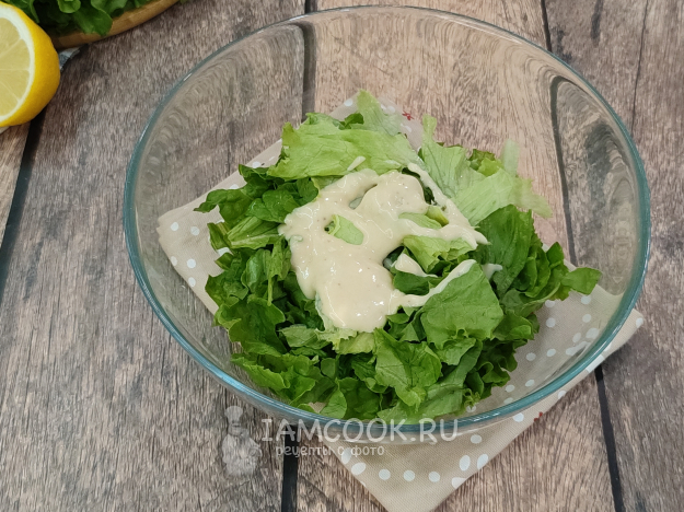 Аккуратно перемешайте, чтобы листья не потеряли воздушность, при этом каждый листочек должен быть покрыт соусом.